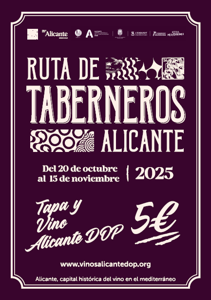 La “Ruta de Taberneros” se prolongará del lunes 20 de octubre al sábado 15 de noviembre, impulsada por el Patronato de Turismo Alicante City&Beach, Turisme Comunitat Valenciana y el Consejo Regulador Denominación de Origen Vinos de Alicante.